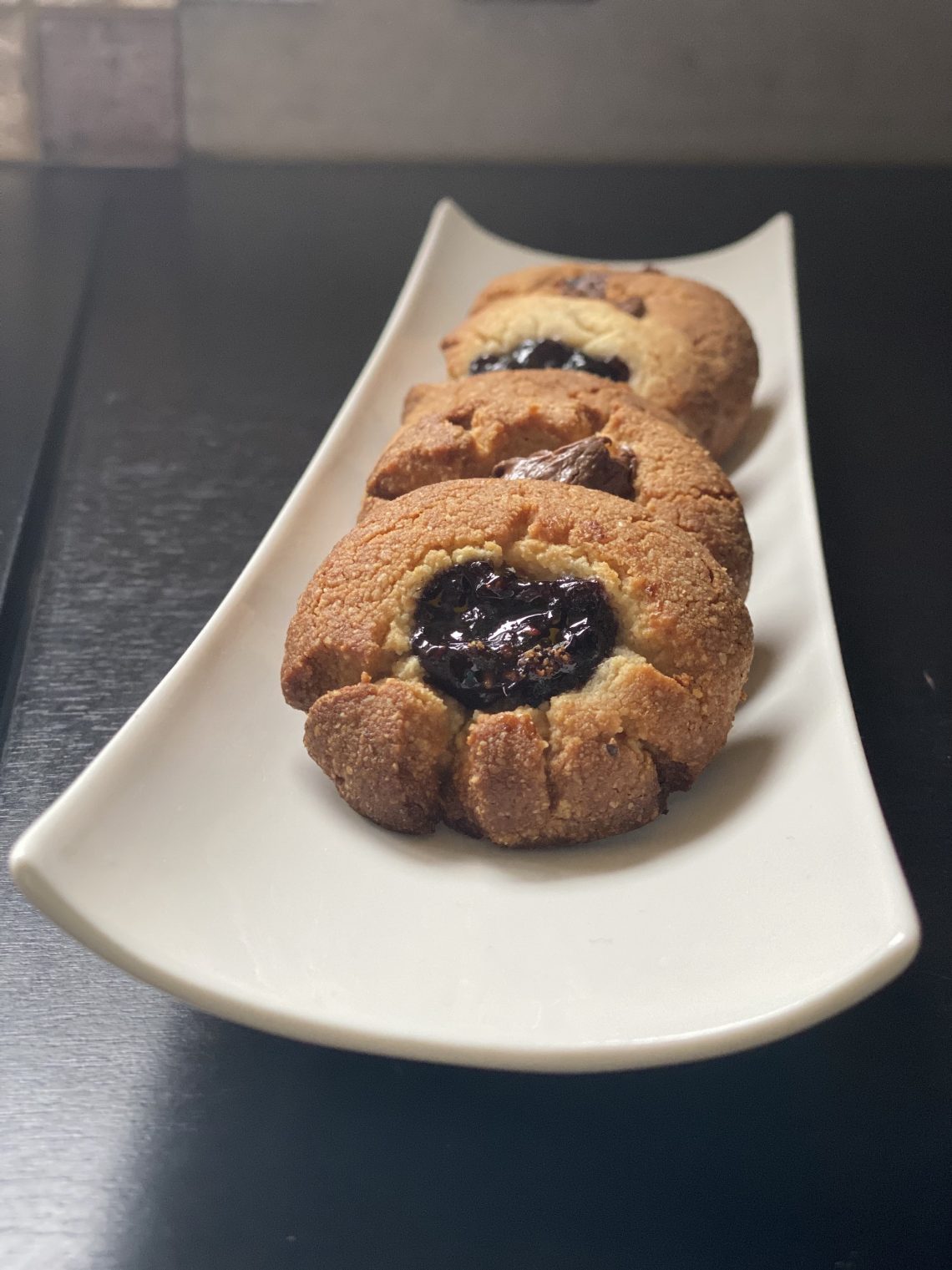 Първо смесих бадемовото брашно, финно смлените трици, кокосовото масло и меда. После оформих топчици от полученето тесто, които натиснах посредата с пръст, за да направя дупка. Наредих ги в тава върху хартия за печене. Напълних с мармалад от къпини, издълбаните дупчици и пуснах бисквитките във фурната. Пекох на въздух за около 15минутки (докато се позачервят) на 180градуса. Бисквитките са мекички с аромат на кокос и свършиха за броени минути у дома! Добре, че щадят фигурите ни… 🙂