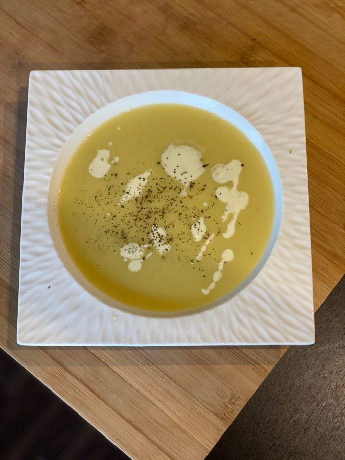 Измих и нарязах на едри кубчета зеленчуците, след което ги сварих в в подсолена вода. Вече сварени и доста горещи зеленчуците, пасирах заедно с маслото. Постепенно, пасирайки, добавих няколко супени лъжици от водата, в която са се варили тиквичките и картофките и кокосовото мляко. Накрая прибавих и заквасената сметана и разбърках, за да се получи гладка крем супата. Поръсих с малко босилек, капнах малко кокосово мляко и Voilà- супичката е готова!