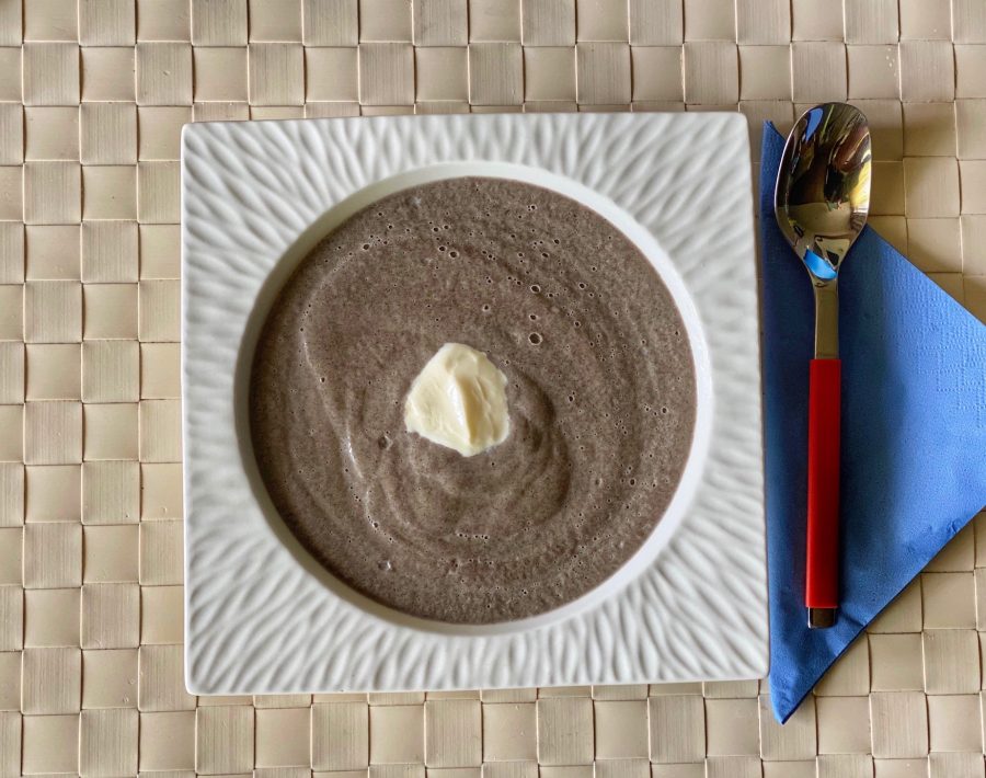 Измих много добре и нарязах на средно големи парчета гъбите и шалота. За кратко ги задуших с малко масло, а после доабвих приблизително 500мл. подсолена вода в тенджерката и започнах да варя зеленчуците. Вече сварени, ги отцедих от водата и ги пасирах в блендер, заедно с остатъка от маслото. Добавих няколко лъжици от горещата вода, в която са се варили гъбите и лукът и една супена лъжица брашно от елда, за гъстота, и отново блендирах. Накрая прибавих и заквасенета сметана и малко черен пипер. Финално пасиране и супата е готова!